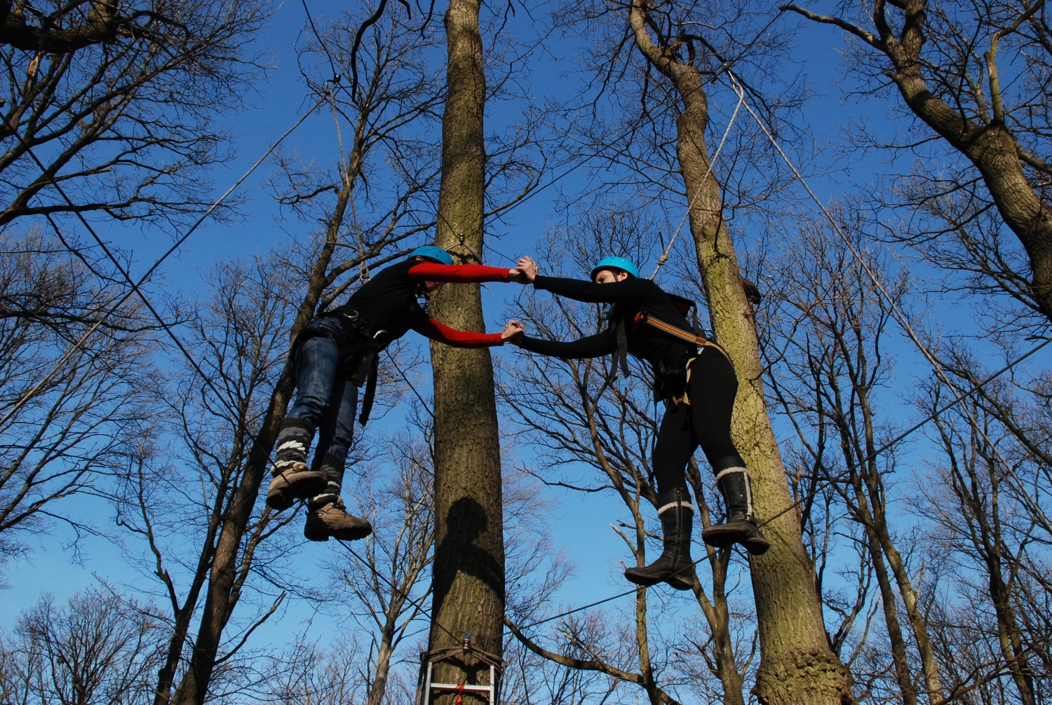 A résztvevőknek 5-7 méter magasban egy V alakban kifeszített drótkötélpályán kell párokban végighaladniuk úgy, hogy minél messzebb jussanak. A kiindulási ponttól távolodva egyre nagyobb lesz a két mászó közötti távolság, melyet egymásban megbízva, különböző technikák segítségével küzdhetnek le. Természetesen alpintechnikai szakember és hegymászó felszerelés segítségével biztosítjuk a résztvevőket. A mászás során a csoport tagjai egymást biztosíthatják a vezetők felügyelete mellett.